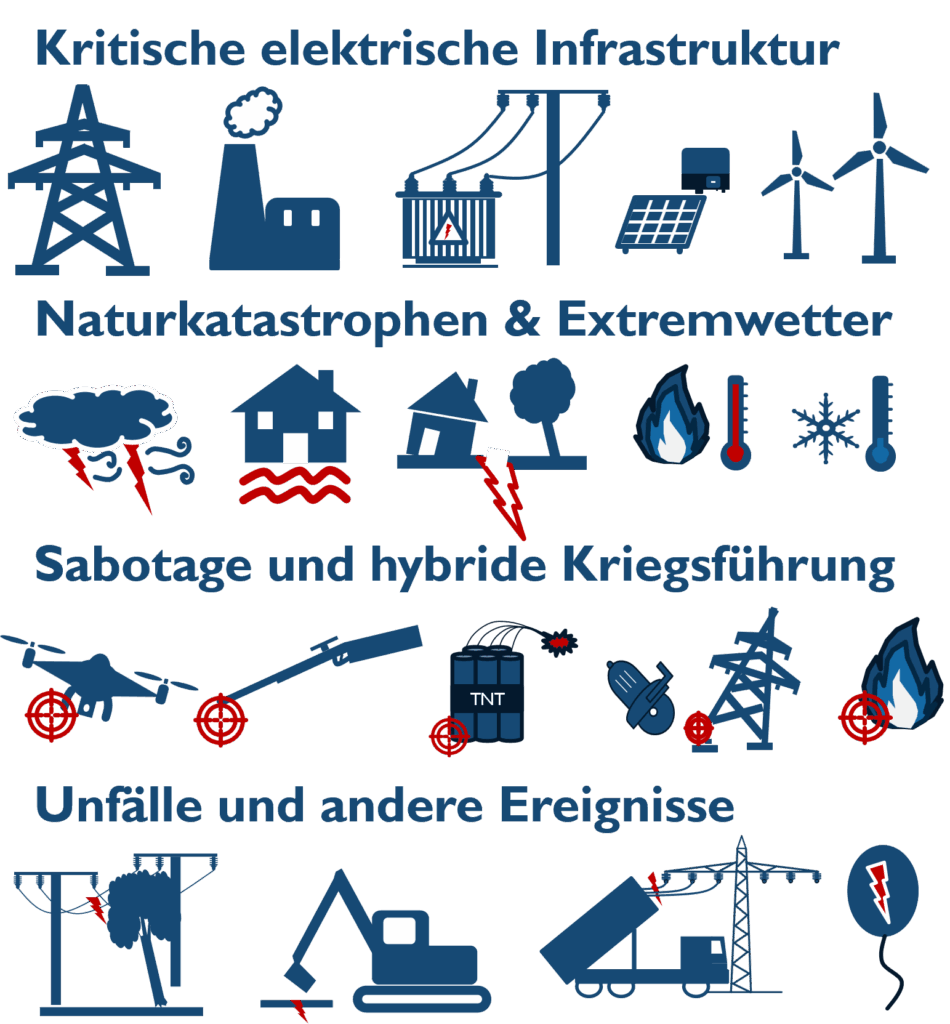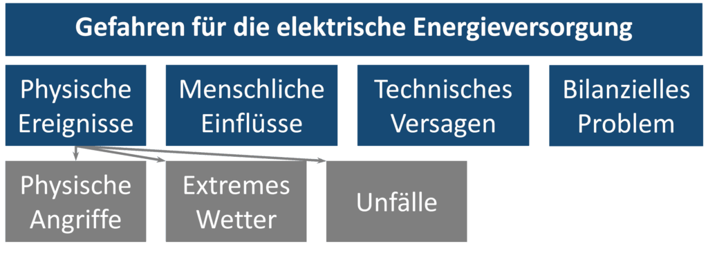 Es ist wichtig zu erwähnen, dass die meisten und größten (hinsichtlich nicht versorgter Kunden) Stromausfälle der Welt durch technisches oder menschliches Versagen verursacht werden, weit weniger durch Naturkatastrophen oder physische Angriffe. Während jedoch das Versagen mehr oder minder einer Stochastik unterliegen, gibt es bei den physischen Angriffen die Dimension der koordinierten Zerstörung hinsichtlich des Zeitpunkts, der Ziele und des Umfangs. Darüber hinaus gibt es bei den Naturkatastrophen die Dimension des großflächigen Zerstörungspotentials. Naturkatastrophen oder physische Angriffe führen damit auch zu wesentlich längeren Ausfallzeiten.