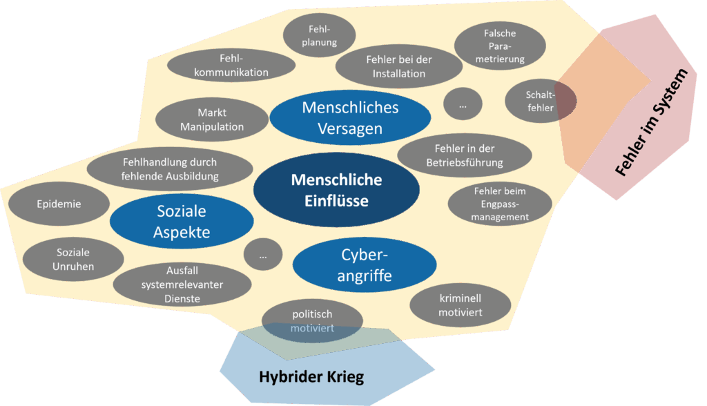 Dennoch müssen bei der Erstellung von Schutzkonzepten alle Einflüsse berücksichtigt werden. Betrachtet man beispielsweise Abbildung 2, so erkennt man die Überschneidung zwischen Bedienfehlern durch Menschen (z. B. Schaltfehler) und technischen Fehlern im System, welche diese Bedienfehler zulassen. Und natürlich spielen Cyberangriffe auch bei physischen Angriffen eine Rolle, denn ein möglicher erster Schritt für einen Cyberangriff ist oft der physische Zugang zu einem Netzwerk.