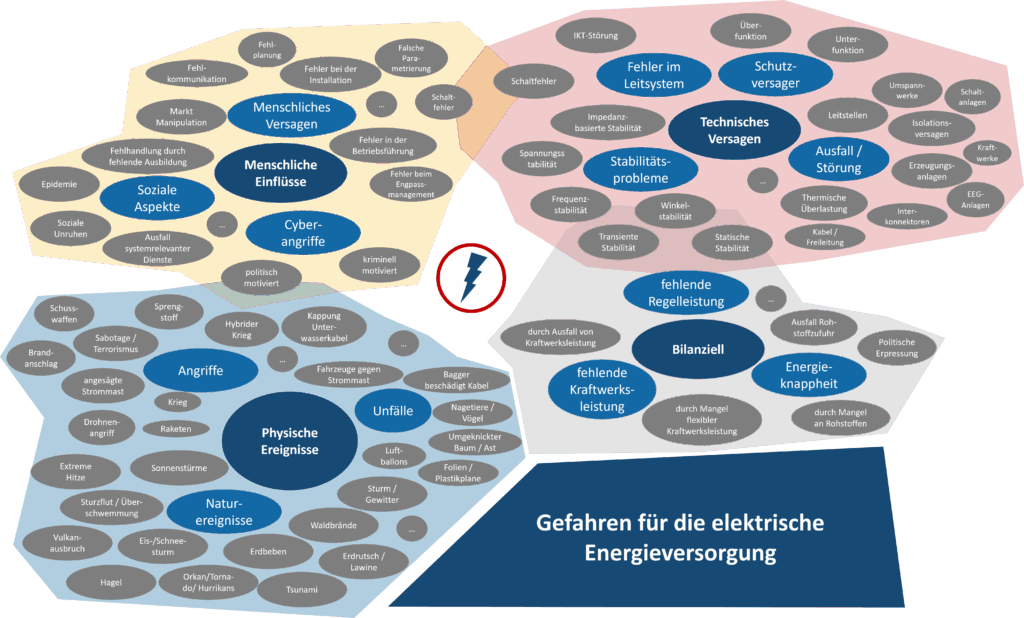 Es gibt einige Gefahren für die elektrische Energieversorgung, für welche die Branche gewappnet sein muss. Grob kann dies in vier Bereiche unterteilt werden: Menschliche, nicht-physische Einflüsse (z.B. menschliches Versagen aber auch Cyberangriffe), technisches Versagen (z.B. Stabilitätsprobleme, Störungen, Ausfälle), bilanzielles Problem (z.B. Strommangellage) und physische Ereignisse und Angriffe (z.B. Extremwetterereignisse, Sabotage, Unfälle).