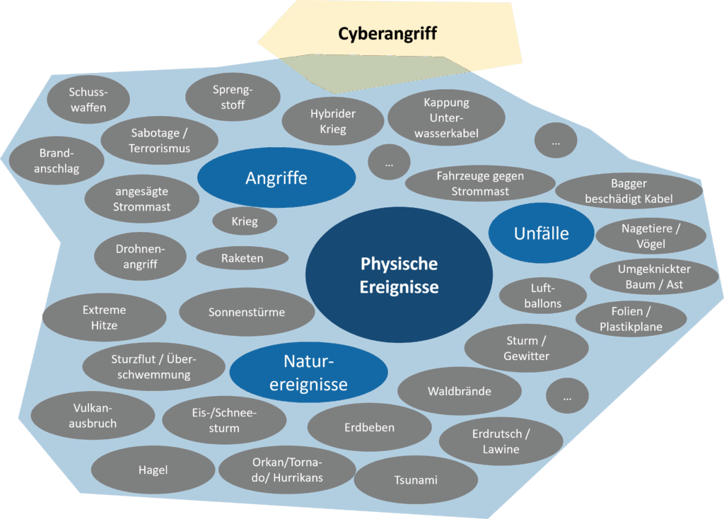 Technikversagen und das bilanzielle Problem werden dabei in die Kategorie „Technikereignis” zusammengefasst, während das Naturereignis eine eigene Kategorie erhält. Cyberangriffe und physische Angriffe werden ebenfalls in eine Kategorie zusammengefasst. Dies ist natürlich eine valide Unterteilung.