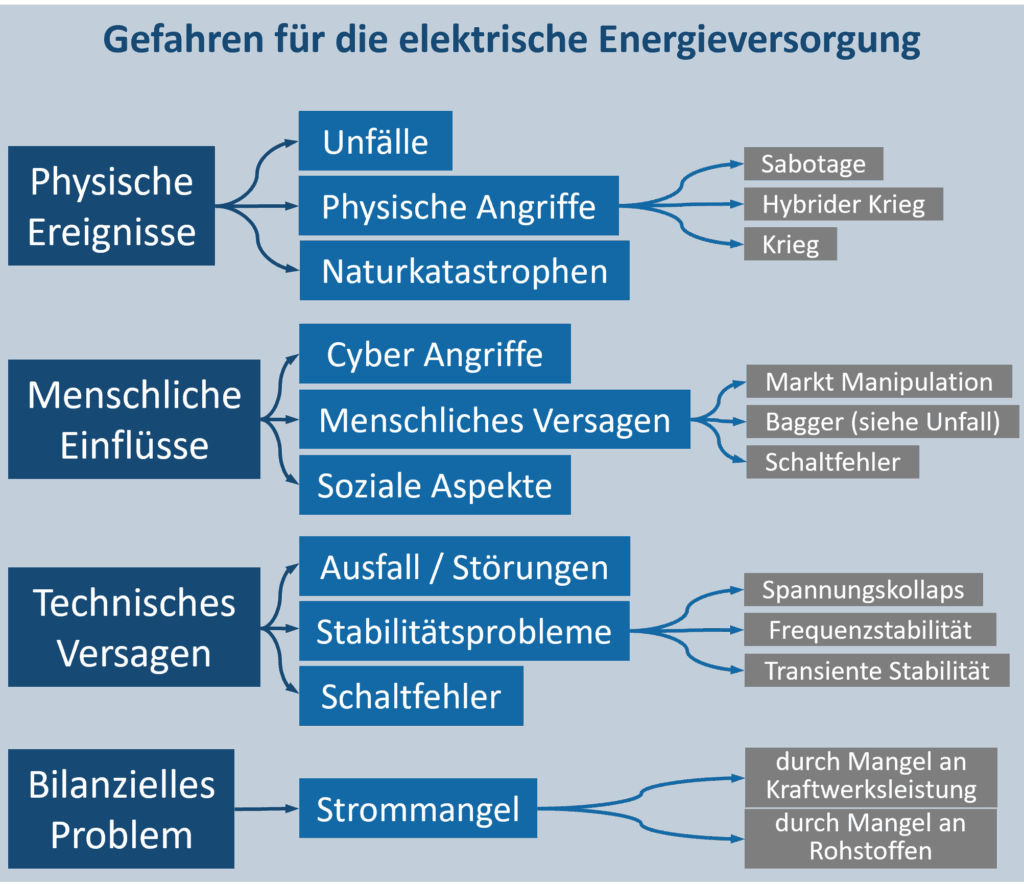 Es gibt einige Gefahren für die elektrische Energieversorgung, für welche die Branche gewappnet sein muss. Grob kann dies in vier Bereiche unterteilt werden: Menschliche, nicht-physische Einflüsse (z.B. menschliches Versagen aber auch Cyberangriffe), technisches Versagen (z.B. Stabilitätsprobleme, Störungen, Ausfälle), bilanzielles Problem (z.B. Strommangellage) und physische Ereignisse und Angriffe (z.B. Extremwetterereignisse, Sabotage, Unfälle).